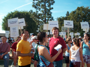 Albert, Rosa, and Alex are the first to get to the team sign-up table.