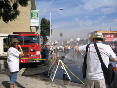 We are getting tired and weary. The LAFD help out by spraying the walkers with cold, refreshing water.